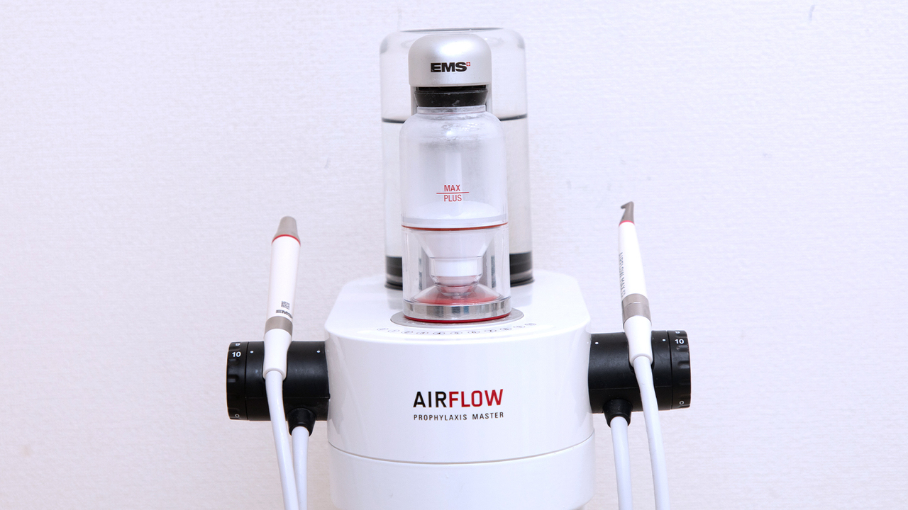 細かなパウダーを歯の表面に吹きつけ、バイオフィルム(細菌の膜)、プラーク(歯垢)、茶渋、タバコのヤニなどを落とします。