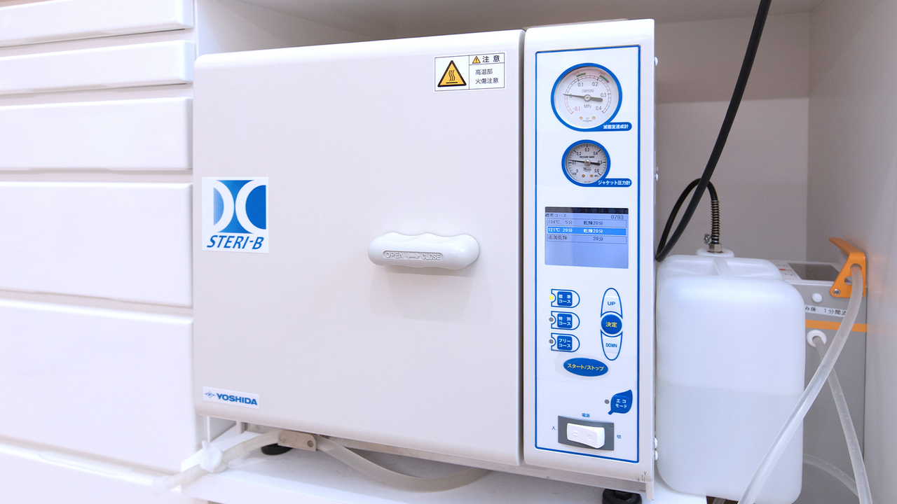 世界で最も厳しいヨーロッパの基準をクリアしたクラスB準拠滅菌器です。治療に使う器具の衛生管理は、徹底的に行っています。