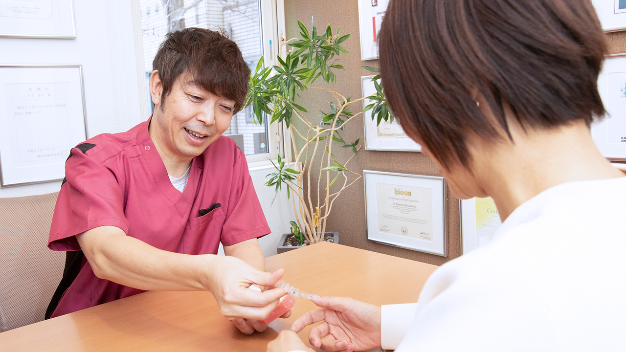まず、気になっている歯並びや、理想の歯並びについてしっかりとお聞きします。その上で、マウスピース型の装置を使った矯正治療とは何か、治療方法や流れなどをご説明。治療にかかる費用や期間もこの時点でお伝えできるので、必要な情報をふまえて、治療を受けるかどうかを決めていただきやすくなっています。