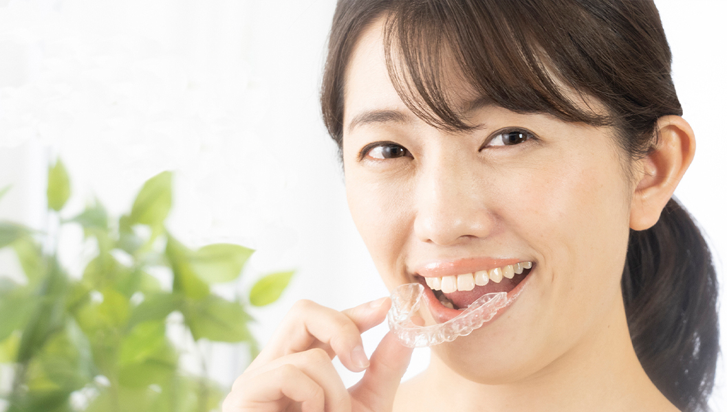 当院では「マウスピース矯正」という、透明なマウスピースをお口に装着して歯並びを改善する矯正治療を採用しています。金属の装置を使った従来の矯正治療に比べて目立たないので、見た目を気にせず治療できます。
