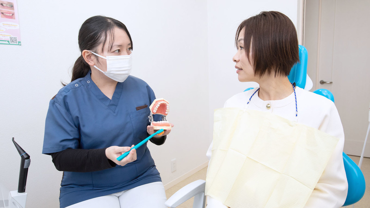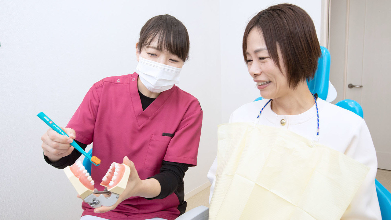 磨き残しのある箇所を患者さまと一緒に確認し、歯の模型を用いた説明や、直接お口の中で歯ブラシを当てながらのアドバイスが可能です。こうした方法で、正しい磨き方を具体的かつ、分かりやすくお伝えしています。