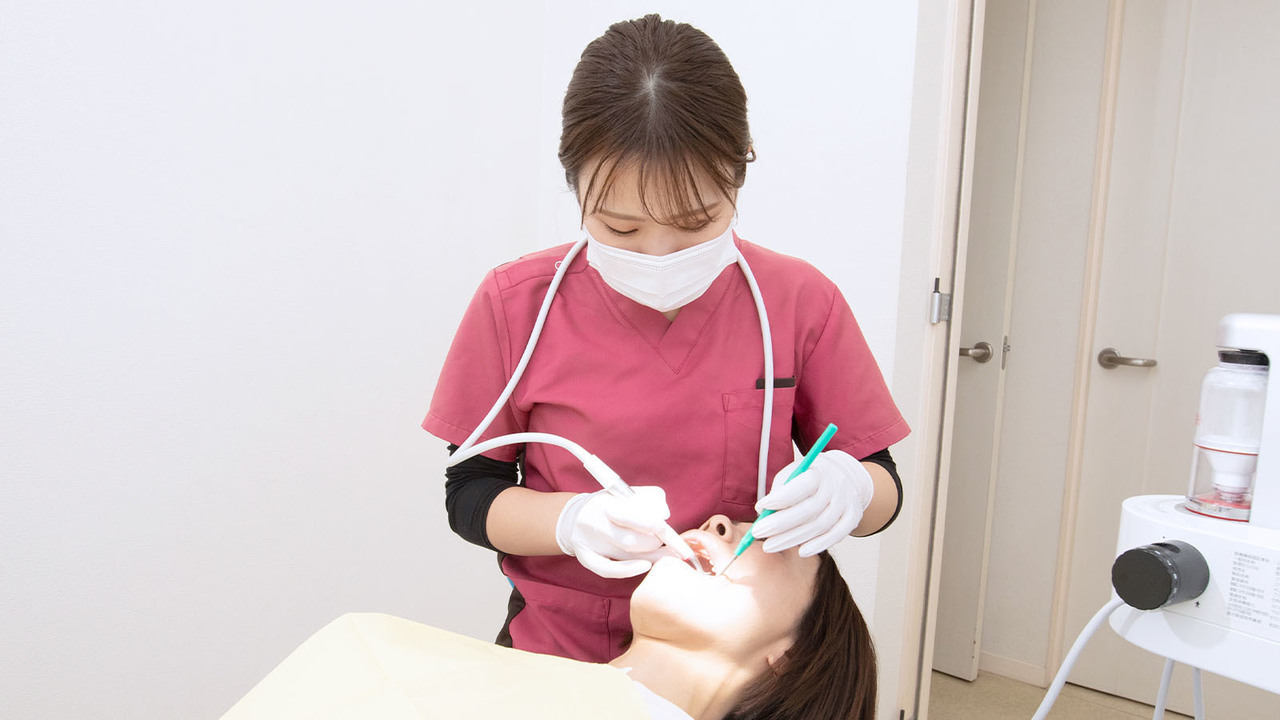 毎回同じ衛生士が担当するので、前回との違いを明確にお伝えできます。その上で、たっぷりとお時間をとり、普段のお手入れでは行き届かない細かな部分まで丁寧にクリーニング。特にエアフローでのパウダートリートメントを併用したPMTC(専門家による機械的歯面清掃)は積極的に行い、歯を傷つけず隅々まで汚れを落としています。